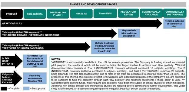 | ● | Veterinary Indications. Based on estimates from industry experts, there may be somewhere between several hundred and several thousand cases of canine babesiosis each year in the United States, and thousands more globally. Currently, standard of care treatment for babesiosis in dogs is a ten-day course of atovaquone and azithromycin, which costs about $1,350 out of pocket. A treatment course of Tafenoquine comprising a single 16-count packet of Arakoda might cost less than $300, offering a compelling alternative to standard of care. The additional resources required to generate enabling data for veterinary uses are much less expensive than human clinical trials and we have completed pilot study at North Carolina State University related to this indication. Separately, the Company is exploring the potential utility of Tafenoquine to manage equine Theileria (a tick-borne disease related to babesiosis). Horses entering the United States are required to be tested prior to quarantine release and treated if positive. |