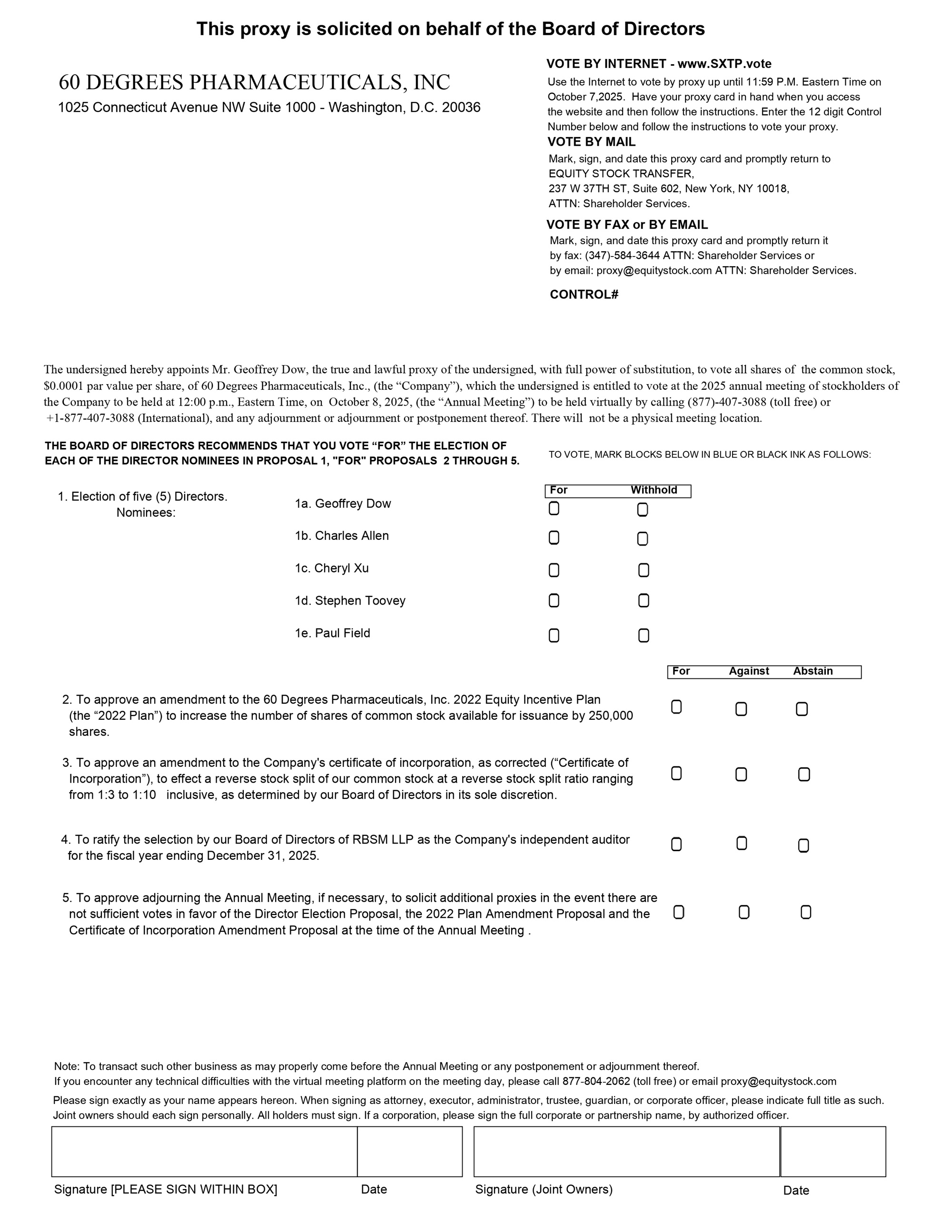 A: At our Annual Meeting, stockholders will vote on: (i) the election of five (5) directors; (ii) to approve an amendment to the 60 Degrees Pharmaceuticals, Inc. 2022 Equity Incentive Plan (the “2022 Plan”) to increase the number of shares of common stock available for issuance by 250,000 shares; (iii) to approve an amendment to our certificate of incorporation, as corrected (“Certificate of Incorporation”), to effect a reverse stock split of our common stock at a reverse stock split ratio ranging from 1:3 to 1:10 inclusive, as determined by our Board in its sole discretion; (iv) the ratification of the selection by our Board of RBSM LLP as our independent auditor for the fiscal year ending December 31, 2025; and (v) such other matters as may come before the meeting. We are not currently aware of any such matters. In addition, following the meeting our management will report on the Company’s performance over the last fiscal year and respond to questions from stockholders.
